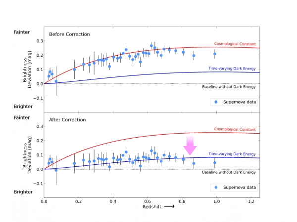 이영욱 교수팀은 Ia형 초신성의 밝기가 모항성 나이에 따라 "광도진화" 효과를 보임을 99.999% 신뢰수준으로 확인했다. 젊은 별 집단의 초신성은 상대적으로 어둡고, 오래된 집단은 더 밝아 기존 거리 측정에 편향이 발생했음을 규명한 이 연구는, 데이터 보정 후 ΛCDM 모형과의 불일치를 입증하며 시간가변 암흑에너지 모델을 지지하는 결과를 도출했다. 추가로 진행 중인 "광도진화 없는 우주론 테스트"의 1차 결과 역시 우주 팽창 감속을 뒷받침해 학계의 논의를 촉발하고 있으며, 이는 27년간 지배적이던 우주론 패러다임 전환의 계기가 될 전망이다.