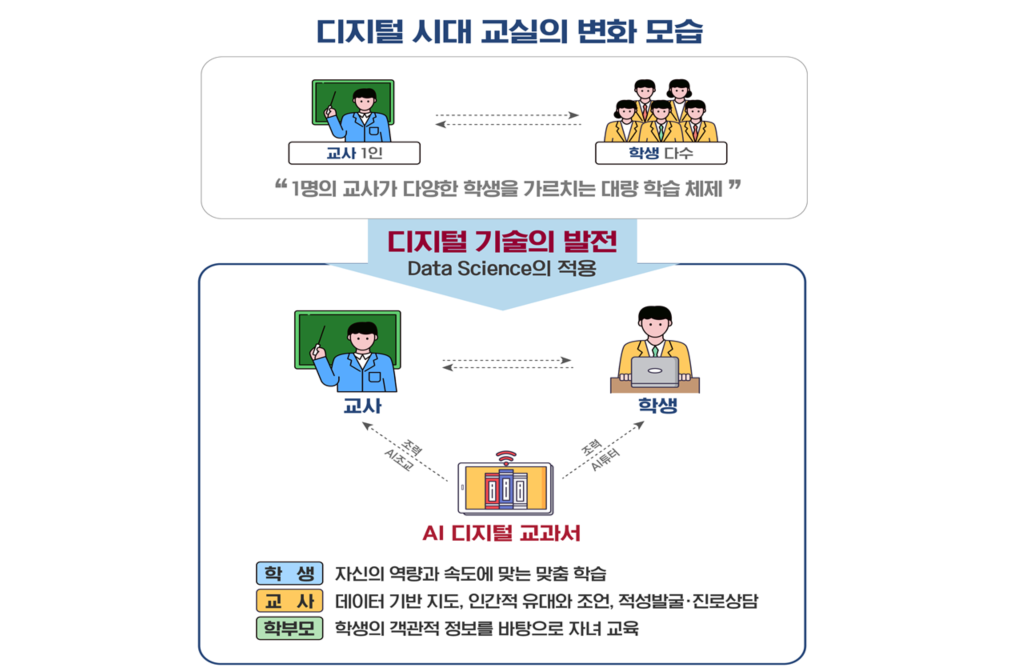2025년 초3·4, 중1, 고1 대상 영어·수학·정보 과목에 AI 디지털교과서가 본격 도입될 예정이며, 2024년 검정심사에서 76종이 합격하여 맞춤형 학습 지원 체계 구축에 박차를 가하고 있다. 이는 학습자 수준 분석 기반 개인화 시스템과 RAG 기반 Edu LLM을 통한 환각 방지 기술로 교육의 질적 혁신을 도모하나, 2025년 8월 국회에서 AI 교과서 지위가 "교육자료"로 강등되며 정책 기조가 급변한 상황이다. 현장에서는 실시간 취약점 진단 기능에 대한 긍정 평가와 기술적 부담 증가에 대한 우려가 공존하며, 교육 인프라 개선과 교사 역량 강화가 시급한 과제로 대두되고 있다.
